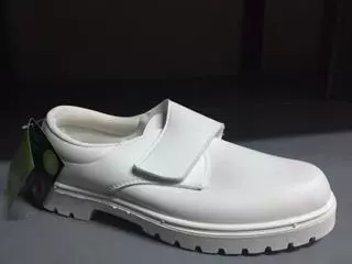 Zapato sanitario cierre velcro, piel LISA, suela de caucho antideslizante con resaltes, plantilla antibacterias, forro textil transpirable, ligero, flexible y anatomico, color blanco. EN-ISO-20347 SRC + 02